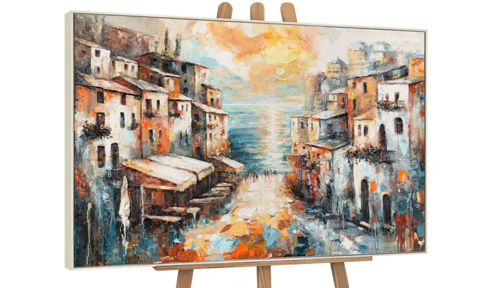 “City by the Sea” is een met de hand geschilderd acrylschilderij op canvas dat de warme sfeer van een mediterrane kustplaats in het licht van de avondzon vastlegt. De combinatie van sterk oranje, blauw en beige geeft het kunstwerk levendigheid en diepte.
