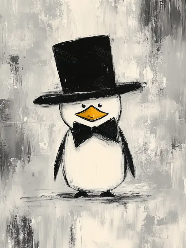 Een speelse pinguïn die indruk maakt met zijn hoge hoed en strik. Deze charmante creatie straalt humor en elegantie uit, waarbij de pinguïn centraal staat op een abstracte achtergrond. De zwart-wit tinten geven het beeld een tijdloze uitstraling, terwijl de felle oranje snavel het geheel opfleurt. Met grove penseelstreken zie je de textuur en beweging, waardoor de pinguïn bijna tot leven komt. Het schilderij past perfect in een moderne woonkamer of kinderkamer. Het roept een glimlach op en brengt een vleugje klasse in je huis.