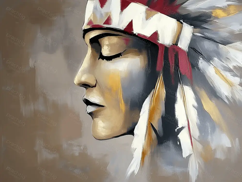 Dit indrukwekkende portret toont een serene inheemse indiaan/chief in profiel. De gesloten ogen stralen rust uit. De aardetinten en subtiele penseelstreken geven het werk een warme uitstraling. De rode en witte veren in haar hoofdtooi springen direct in het oog. De zachte achtergrond zorgt voor een harmonieuze balans. Dit schilderij voegt een vredige sfeer toe aan jouw interieur en trekt de aandacht met zijn fijne details en krachtige uitstraling.