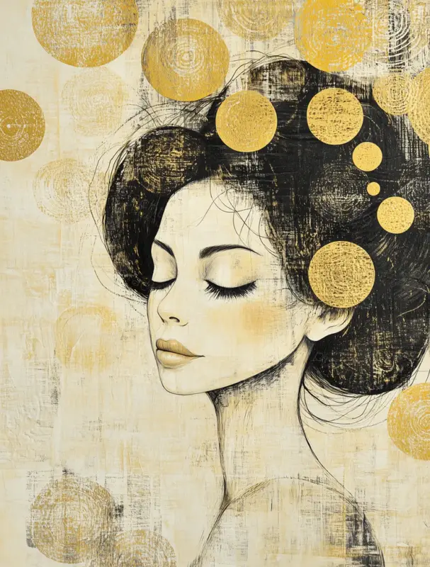 Achat Immédiat Dromerige Vrouw met Gouden Cirkels – Olieverf / 30×40