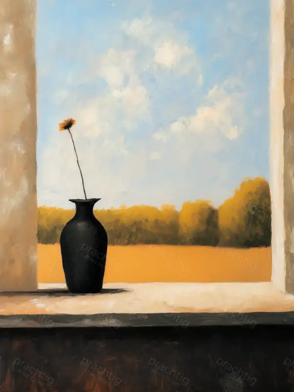Een zwarte vaas met een enkele bloem staat centraal voor een open raam. De achtergrond toont een uitgestrekt, goudgeel landschap onder een heldere blauwe hemel met zachte wolken. De warme tinten en het contrast tussen de vaas en de achtergrond geven het schilderij een serene en dromerige uitstraling. De penseelstreken zijn subtiel en gedetailleerd, waardoor de textuur van het doek tot leven komt. Deze compositie straalt eenvoud en rust uit, ideaal voor in een woonkamer of slaapkamer. Laat je meevoeren door de stilte en ruimte die dit schilderij oproept.