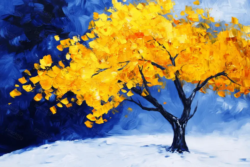 Een stralende boom met gouden bladeren schittert tegen een diepblauwe achtergrond. De dikke, expressieve penseelstreken benadrukken de beweging van het loof, alsof de wind erdoorheen ruist. Het contrast tussen de warme gele tinten en de koele blauwe lucht maakt het tafereel levendig. De boom staat stevig in een met sneeuw bedekt landschap, wat een serene winterse sfeer creëert. Dit schilderij doet denken aan de werken van Vincent van Gogh, door het gebruik van gedurfde kleuren en dynamische penseeltechnieken. Breng een warme en bijzondere sfeer in je ruimte met dit opvallende werk.