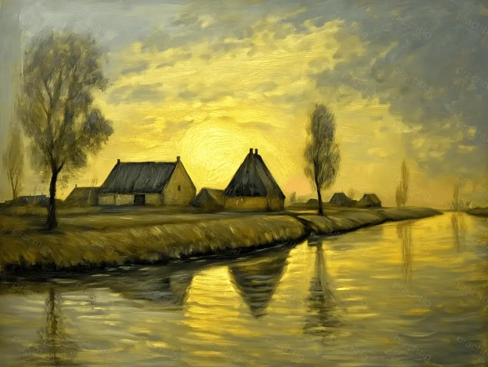 Ervaar de serene schoonheid van een landelijke zonsondergang. Dit schilderij toont een rustige rivier die het zonlicht weerspiegelt, omgeven door een vredig landschap. De warme gouden tinten stralen een gevoel van kalmte uit. De huizen en bomen vormen een harmonieuze compositie met de lucht. Het spel van licht en schaduw geeft het werk een levendige diepte. Dit landschap brengt rust in jouw ruimte en neemt je mee naar een tijdloze wereld.