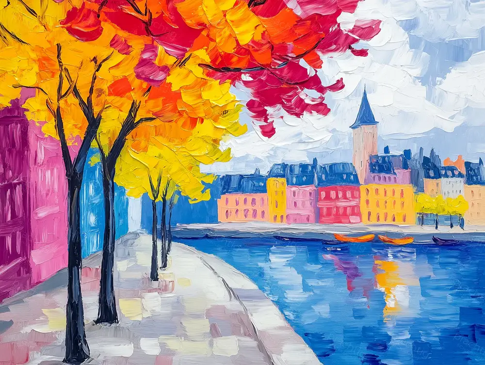 De levendige kleuren van de herfst springen direct in het oog. Bomen met vurige rode en gele bladeren strekken zich uit over een rustige, kronkelige boulevard. De onderliggende stad weerspiegelt in het kalme blauwe water, met pastelkleurige gebouwen die warmte uitstralen. De olieverftechniek toont krachtige penseelstreken die diepte en dynamiek geven aan de scène. Deze stijl maakt de stadsgezichten levendig en vol energie. De compositie nodigt uit tot een wandeling langs het water, alsof je zelf in de schilderachtige stad bent. Hang dit schilderij in je woonkamer of hal voor een speelse en inspirerende sfeer.