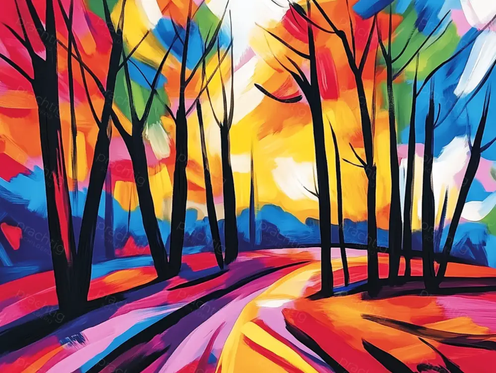Duik in de levendige wereld van dit kleurrijke herfstbos. Schitterende tinten van oranje, rood, en blauw dansen samen om een betoverend landschap te creëren. De hoge, slanke bomen steken indrukwekkend af tegen de felle achtergrond, waardoor een dynamische diepte ontstaat. Deze expressieve stijl brengt energie en warmte in jouw ruimte. Hang dit meesterwerk in je woonkamer, kantoor of zelfs je slaapkamer voor een knusse en artistieke sfeer. Het schilderij nodigt uit tot beweging en verbeelding, waardoor je elke dag opnieuw inspiratie vindt.