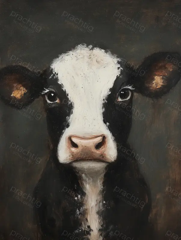 Dit schilderij toont een koe die recht in je ogen kijkt. De donkere achtergrond benadrukt de witte en zwarte vlekken van de koe, waardoor haar blik nog meer opvalt. De expressieve ogen lijken bijna te spreken, en trekken direct je aandacht. De penseelstreken zijn duidelijk zichtbaar, vooral in de vacht en de neus, wat een tastbare textuur geeft. Dit kunstwerk straalt rust en eenvoud uit en brengt een vleugje landelijke charme in jouw ruimte. Perfect voor in de woonkamer of keuken, waar je dagelijks van haar vriendelijke blik kunt genieten.
