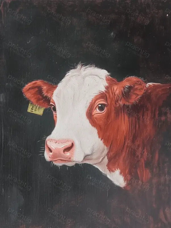 Een nieuwsgierige rode koe steekt zijn kop naar voren tegen een donkere achtergrond. De warme roodtinten van de koe contrasteren sterk met de donkere ondergrond. Je ziet de fijne penseelstreken die zorgen voor een levendig en realistisch effect. De duidelijke lijnen en schaduwen geven het werk diepte. Dit schilderij past goed in een landelijke en warme setting, zoals een boerderijthema. Het voegt een rustieke charme toe aan je ruimte.