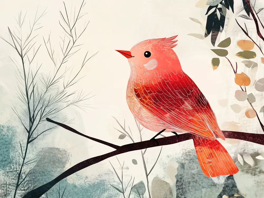 Een levendige rode vogel zit rustig op een tak, omringd door subtiele, natuurlijke details. De zachte tinten van de achtergrond zorgen voor een kalme sfeer. De vogel staat in fel contrast met de lichte omgeving, wat diepte en focus creëert. Het gebruik van dunne penseelstreken benadrukt de delicate veren. Dit werk past perfect in een natuurlijk interieur en brengt een warme en vrolijke uitstraling.