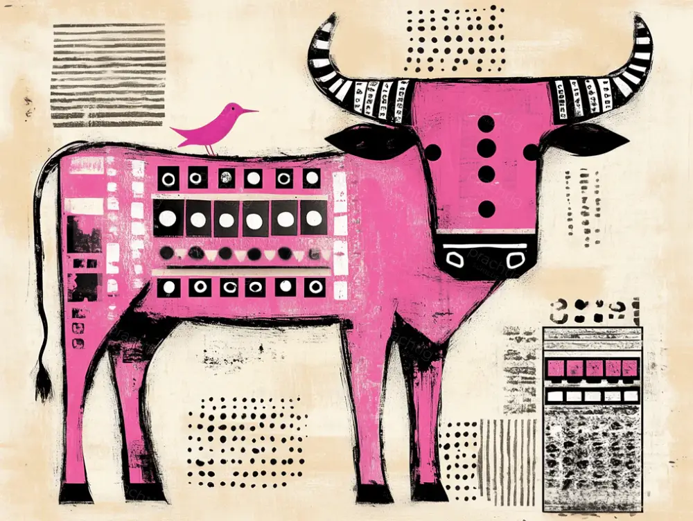 Ontdek het unieke tafereel van een roze stier met een speels vogeltje op zijn rug. De stier is gedetailleerd met geometrische patronen in zwart en wit. Opvallende stippen en strepen maken het geheel levendig. De achtergrond heeft een neutrale tint, waardoor de kleuren van de stier eruit springen. Dit werk combineert dieren en abstracte elementen op een verrassende manier. Ideaal voor een moderne woonkamer of kinderkamer.