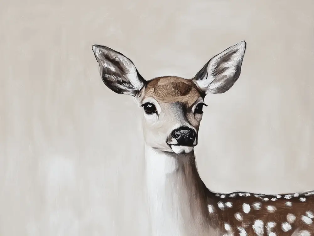 Ontdek de innemende charme van dit jonge hert. Het dier kijkt nieuwsgierig de wereld in, met grote, sprekende ogen. De zachte bruine tinten van zijn vacht contrasteren subtiel met de lichte achtergrond. Deze combinatie zorgt voor een rustige, natuurlijke uitstraling. De fijne penseelstreken geven het werk detail en levensecht karakter. Ideaal voor liefhebbers van dieren en natuur. Het brengt een serene en warme sfeer in je kamer.