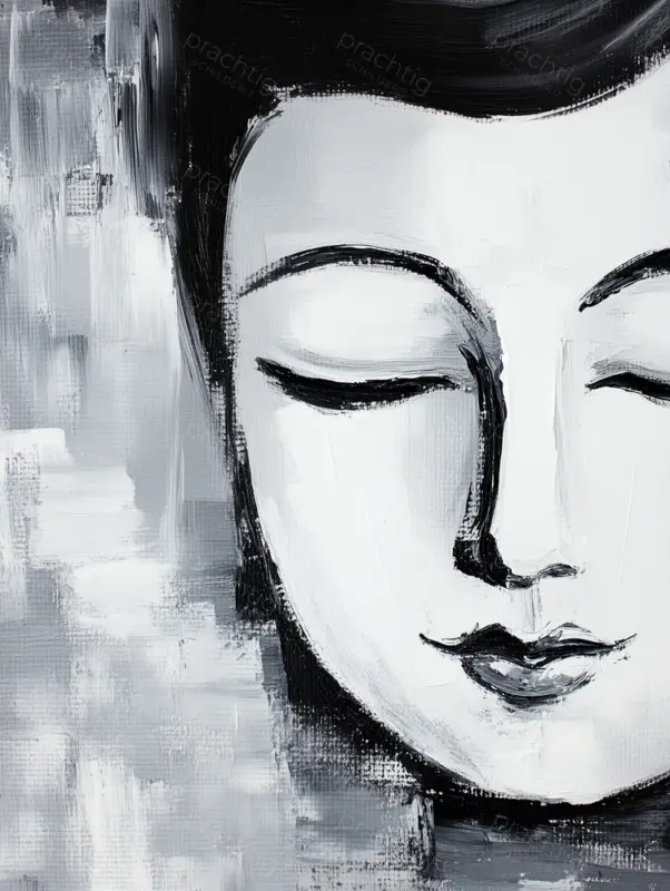Dit schilderij toont een vredig gezicht met gesloten ogen. De monochrome kleuren, voornamelijk zwart, wit en grijs, geven een gevoel van rust en stilte. De dikke penseelstreken suggereren een krachtige techniek die textuur en diepte toevoegt. Het gezicht is zorgvuldig afgebeeld met vloeiende lijnen en subtiele schaduwen, waardoor een kalmerende sfeer ontstaat. De minimalistische benadering en zachte contrasten maken het een meditatie op innerlijke vrede. Hang dit werk in je slaapkamer, woonkamer of meditatiehoek om een rustige omgeving te creëren.