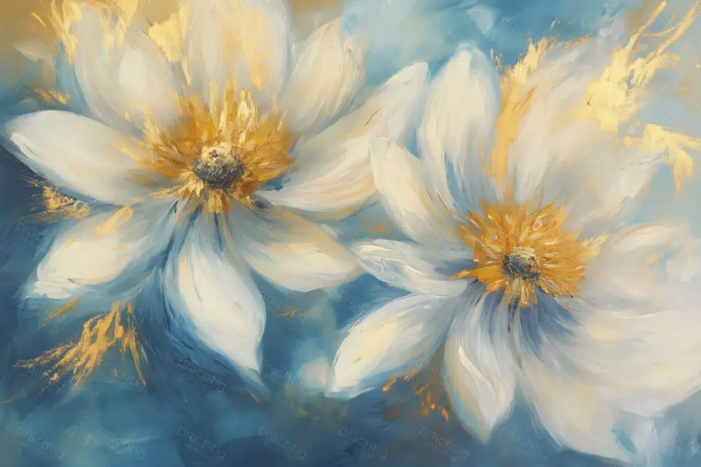 Twee prachtige bloemen dansen tegen een blauwe achtergrond. De witte bloemblaadjes stralen met gouden accenten, wat zorgt voor een warme uitstraling. De penseelstreken zijn energiek en vloeiend, waardoor de bloemen bijna bewegen. Het contrast tussen de zachte kleuren en de levendige tinten geeft een frisse sfeer. Perfect voor de woonkamer of slaapkamer, deze compositie brengt een vleugje natuur en rust in je huis.