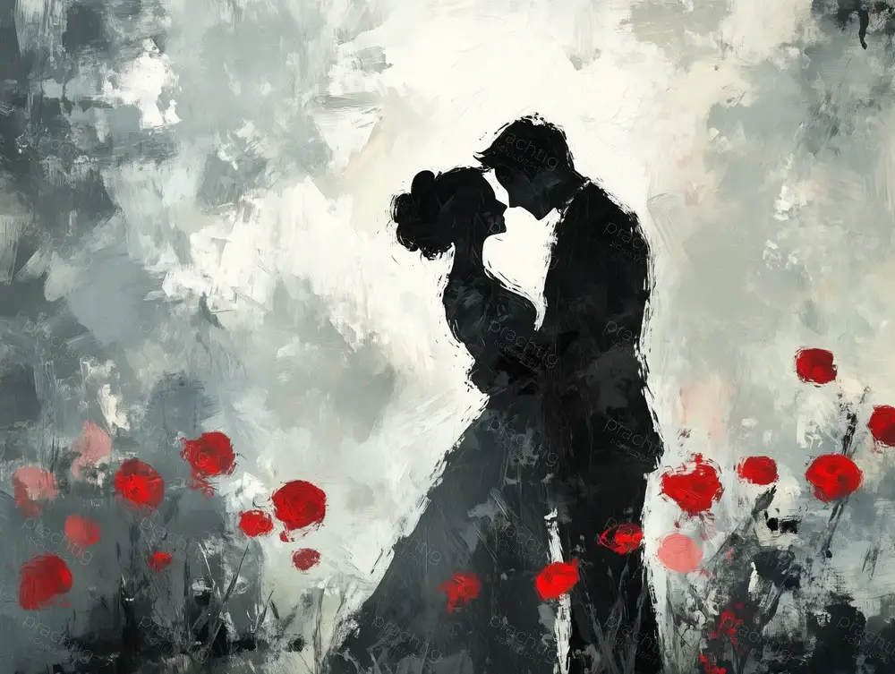 Een romantisch tafereel ontvouwt zich in dit schilderij. Twee silhouetten staan in een innige omhelzing, omringd door felrode bloemen. De achtergrond is een mengeling van grijstinten, die een gevoel van mysterie en diepte geven. De rode bloemen vormen een levendig contrast en trekken meteen de aandacht. De penseelstreken zijn expressief en geven het geheel een dynamische uitstraling. Deze combinatie van abstractie en realisme nodigt uit tot dromen. Perfect voor de slaapkamer of een sfeervolle hoek in de woonkamer. Het roept emoties van liefde en verbondenheid op, en nodigt je uit om even stil te staan bij het moment.