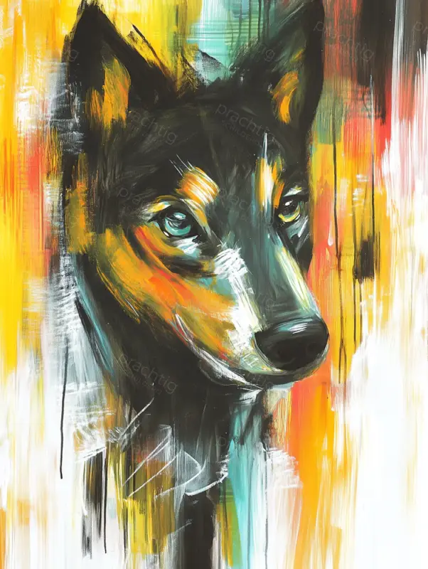 Een indrukwekkend portret van een wolf, dat direct je aandacht grijpt. De intense ogen van de wolf kijken je aan, alsof ze je ziel doorgronden. Rijke tinten van oranje, geel en turquoise contrasteren prachtig met het zwarte en witte vacht van de wolf. De kunstenaar heeft expressieve penseelstreken gebruikt, waardoor beweging en textuur ontstaan. Deze techniek geeft de wolf een levendige uitstraling. De abstracte achtergrond creëert een dynamische sfeer, die de kracht en mysterie van de wolf benadrukt. Dit kunstwerk past perfect in een moderne woonkamer of creatieve werkruimte, waar het een krachtig statement maakt.