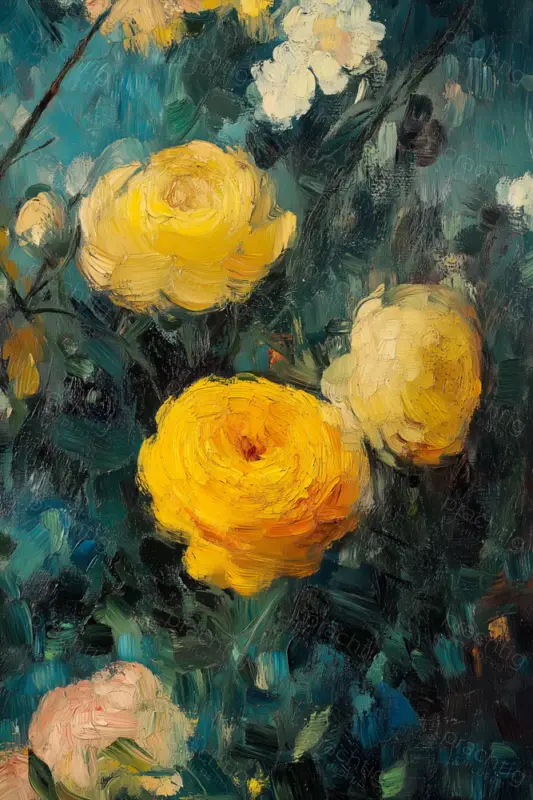 Stralende gele bloemen staan centraal in dit levendige schilderij. De dikke penseelstreken geven de bloemen een bijna tastbare textuur. Ze lijken bijna uit het doek te komen. De achtergrond is een mix van diepe groene en blauwe tinten. Deze kleuren zorgen voor een prachtig contrast met de gele en witte bloemen. De compositie straalt energie en frisheid uit. Het schilderij nodigt uit tot closer kijken, waardoor je steeds nieuwe details ontdekt. De expressieve stijl maakt het ideaal voor een ruimte waar je dagelijks komt. Een echte blikvanger voor in de woonkamer of eetkamer.