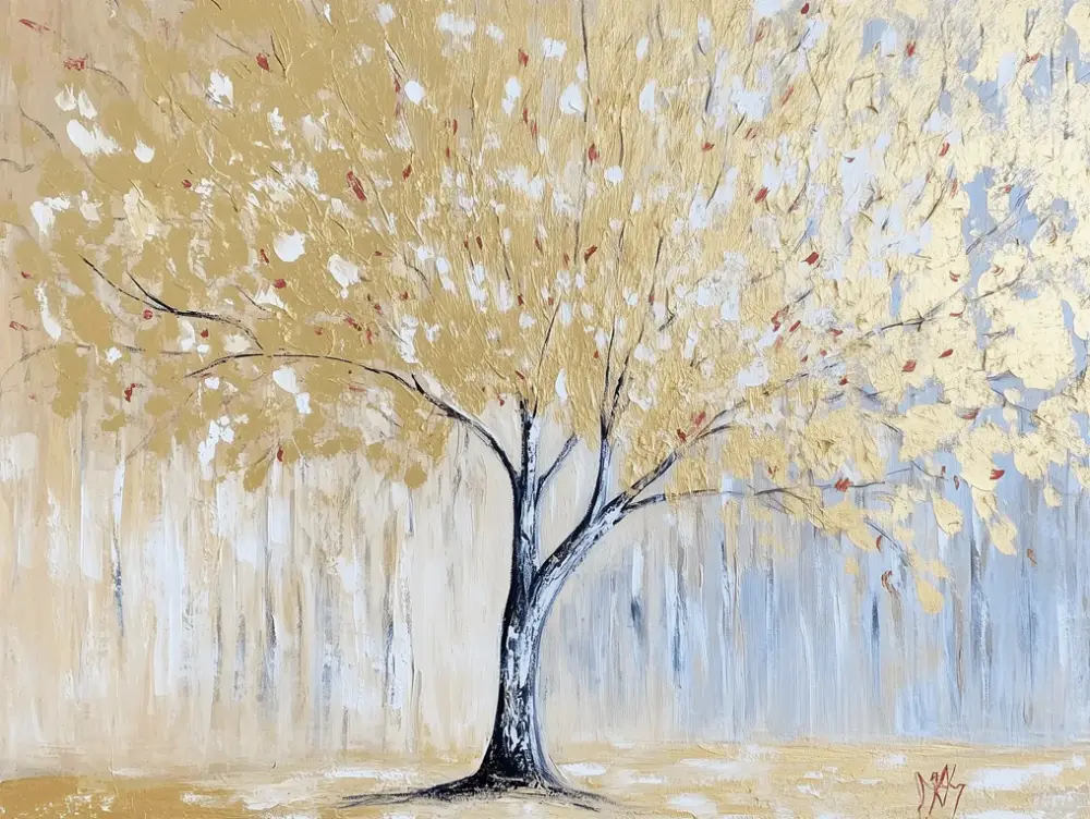 Ontdek de schoonheid van een gouden boom in de herfst. Warme gouden tinten vullen het canvas, terwijl zachte penseelstreken de bladeren tot leven brengen. Het contrast tussen de zwarte stam en de lichte achtergrond zorgt voor een bijzondere diepte. Deze compositie ademt rust en charme uit. Het subtiele gebruik van rood voegt een vleugje levendigheid toe. Een perfecte aanvulling voor je woonkamer of werkruimte. Geniet van de serene sfeer die dit kunstwerk met zich meebrengt.