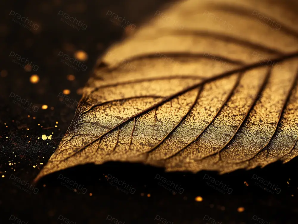 Dit schilderij vangt de schoonheid van een herfstblad in goudtinten. Het lijkt alsof het blad oplicht tegen een donkere achtergrond, wat een gevoel van warmte en mysterie oproept. De fijne details in de nerven en de textuur van het blad maken het bijna tastbaar. De gouden spikkels op de achtergrond geven een sprankelende en elegante sfeer aan het geheel. De combinatie van licht en schaduw zorgt voor een dramatisch effect dat perfect past in een modern interieur. Hang het in de woonkamer of een stijlvolle kantoorruimte om een warme en uitnodigende sfeer te creëren. Dit werk is een eerbetoon aan de natuur en de vergankelijkheid ervan.