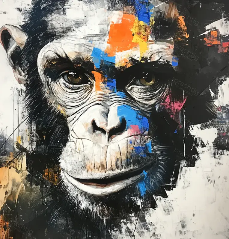 Deze intrigerende aap trekt je aandacht met zijn intense, doordringende blik. Heldere kleuren als oranje, blauw en roze spat er vanaf, waardoor een spannend contrast ontstaat met de donkere achtergrond. De grove penseelstreken geven het werk een energieke uitstraling. Het gezicht van de aap komt tot leven door de gedetailleerde texturen en schaduwen. Combineer dit unieke stuk met een moderne inrichting voor een gedurfde en levendige uitstraling.