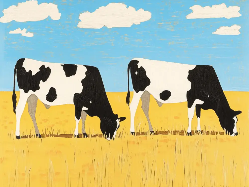 Twee zwart-witte koeien staan rustig te grazen op een felgele weide. De heldere blauwe lucht met verspreide witte wolken creëert een serene achtergrond. De eenvoud van de compositie trekt je blik naar de subtiele details in de vacht en de textuur van het gras. Het beeld straalt rust en landelijke charme uit. Een perfecte keuze voor een ruimte waar je een vleugje natuur wilt toevoegen.