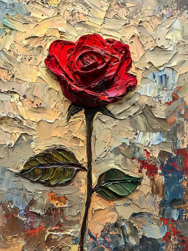 Een enkele, stralende rode roos bloeit krachtig vanuit het midden van dit schilderij. De achtergrond bestaat uit een wirwar van warme tinten, variërend van beige en crème tot subtiele blauwen en rode vlekken. Deze kleurencombinatie laat de roos nog meer opvallen. De dikke, expressieve penseelstreken geven het schilderij een tastbare textuur, waardoor de bloem bijna driedimensionaal lijkt. De stijl doet denken aan de levendige techniek van Van Gogh, met zijn krachtige bewegingen en speelse kleurgebruik. Dit schilderij brengt warmte en levendigheid in elke ruimte. Het is ideaal voor de woonkamer of eetkamer, waar het een gesprekspunt kan vormen. De roos symboliseert liefde en schoonheid, wat een gevoel van romantiek en energie uitstraalt. De combinatie van de gedurfde penseelstreken en de opvallende kleuren maakt het kunstwerk zowel dynamisch als sfeervol.