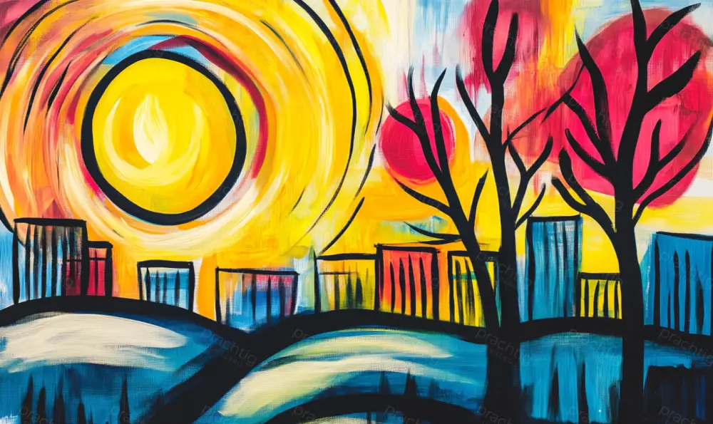 Dit schilderij vangt de energie van een opkomende zon boven een stad. De grote, ronde zon straalt met heldere, geel en oranje tinten. Op de voorgrond zie je donkere silhouetten van bomen, die de levendige kleuren van de hemel en gebouwen erachter benadrukken. De skyline bestaat uit abstracte, kleurrijke gebouwen die variëren van blauw tot roze. Deze combinatie van felle en diepe kleuren geeft een dynamische sfeer. Het contrast tussen de warme zon en de koele tinten van de stad en bomen maakt dit werk een echte blikvanger. Hang het in je woonkamer of kantoor voor een frisse en inspirerende uitstraling.