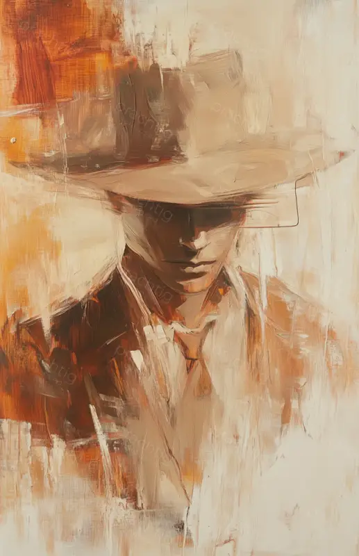 Ontdek de mysterieuze uitstraling van een cowboy, gevangen in warme bruine en oranje tinten. Zijn gezicht is deels verborgen onder een brede hoed, wat een krachtige schaduw creëert. De dynamische penseelstreken geven beweging en diepte aan het beeld. De combinatie van subtiele en felle kleuren zorgt voor een boeiende sfeer. Het schilderij doet denken aan de stijl van beroemde Nederlandse meesters. Plaats dit indrukwekkende stuk in jouw woonkamer of studeerkamer en laat je inspireren door zijn stille kracht.