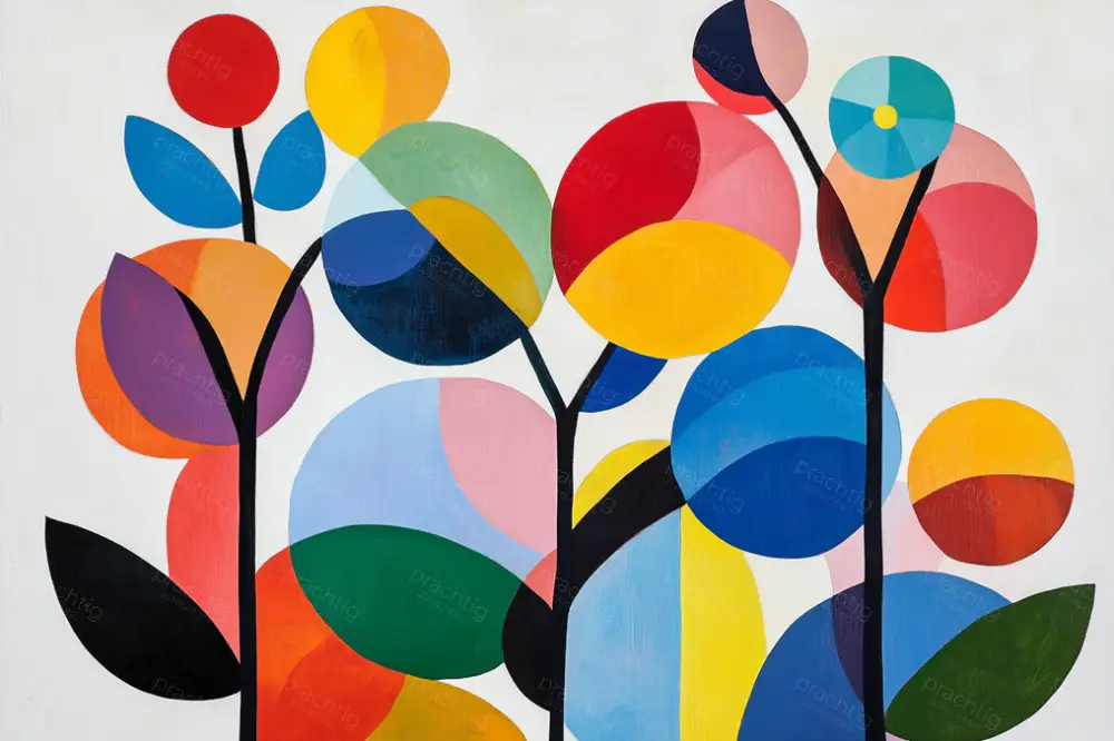 Je ziet kleurrijke bollen die op takken lijken te zweven tegen een lichte achtergrond. De heldere kleuren zoals rood, geel en blauw geven een speelse uitstraling. Zwarte lijnen verbinden de vormen en geven structuur aan het geheel. Contrast tussen de levendige tinten en de witte achtergrond zorgt voor een frisse look. De compositie is dynamisch en nodigt uit om langer te kijken. Het doet denken aan geometrisch abstracte kunst en past goed in een moderne woonkamer of kantoor.