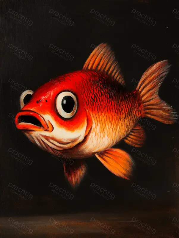De goudvis zweeft moeiteloos tegen een diepzwarte achtergrond. Zijn levendige oranje en rode tinten brengen hem tot leven. De grote, opvallende ogen geven hem een nieuwsgierige uitstraling. Elke schub is met zorg aangebracht, wat de vis een realistisch karakter geeft. De techniek van olieverf zorgt voor diepte en textuur. Dit werk straalt een combinatie van eenvoud en detail uit. Hang het in de woonkamer of kinderkamer en je hebt een echte blikvanger. Het schilderij nodigt uit om even stil te staan en te genieten van de speelse interpretatie van de natuur.