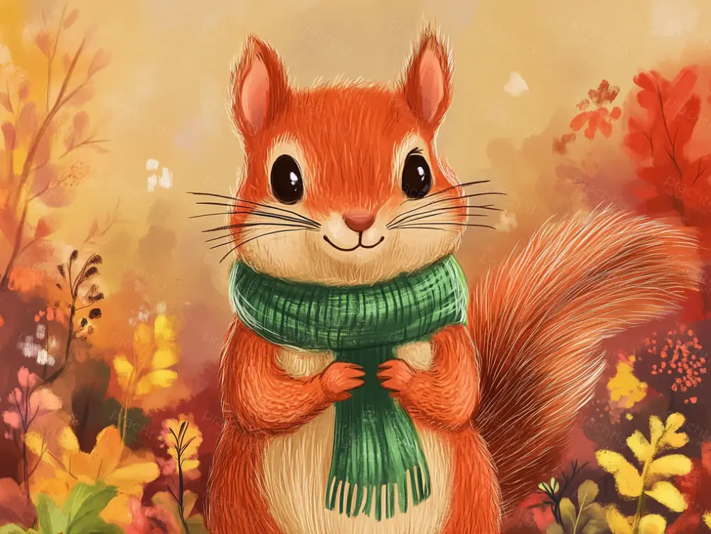 Dit schattige eekhoorntje staat centraal in een warme herfstomgeving. De oranje tinten van zijn vacht contrasteren mooi met het diep groene van de sjaal. De achtergrond toont gedetailleerde herfstbladeren in rood en geel, wat een gezellige en knusse sfeer creëert. De grote, glanzende ogen van de eekhoorn zorgen voor een speelse uitstraling. Dit schilderij brengt de warmte van de herfst rechtstreeks jouw huis binnen.