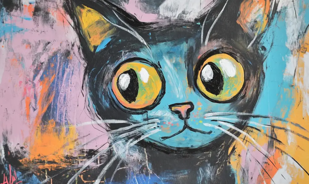 Ontdek de speelsheid van dit schilderij met een grote kat die je direct aankijkt. De felle kleuren springen eruit: blauw, roze en oranje vormen een levendige achtergrond. De grote, expressieve ogen van de kat trekken je aandacht en geven het werk een charmante uitstraling. Dit schilderij geeft elke ruimte een vrolijke en energieke uitstraling. Perfect voor de kinderkamer of een creatieve werkplek. Verrijk jouw interieur met deze unieke blikvanger!