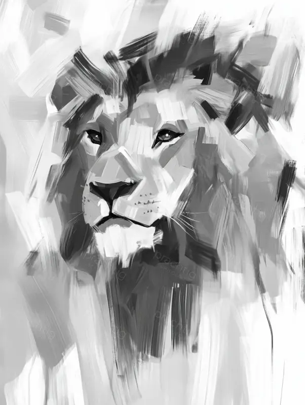 Dit indrukwekkende portret van een leeuw trekt direct je aandacht. De krachtige zwarte en grijze penseelstreken vormen een indrukwekkend beeld van deze majestueuze koning van de dieren. De leeuw kijkt met een vastberaden blik, zijn ogen stralen kracht en wijsheid uit. De dynamische penseelstreken geven het geheel een levendige en energieke uitstraling. Met een moderne twist in de stijl van het impressionisme voegt dit kunstwerk een vleugje elegantie toe aan elke ruimte. Hang het in je woonkamer, kantoor of slaapkamer voor een inspirerend middelpunt dat gesprekken op gang brengt. De eenvoud van de kleuren past perfect bij diverse interieurstijlen en voegt een gevoel van rust toe.