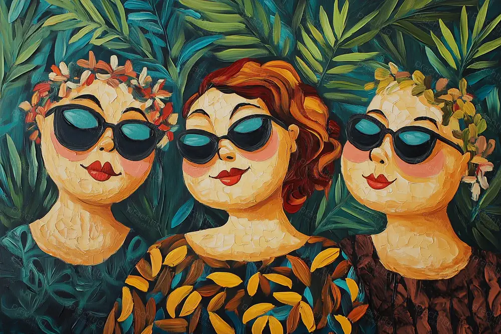 Dompel je onder in een vrolijke wereld vol kleur en karakter. Dit schilderij toont drie dames met zonnebrillen, gehuld in een weelderige groene omgeving. De bladeren op de achtergrond geven een tropisch gevoel, terwijl de warme, levendige tinten in het haar en de kleding van de dames zorgen voor een speels contrast. De expressieve penseelstreken en het gebruik van dikke verf geven het werk een dynamische, bijna tastbare textuur. Deze stijl doet denken aan het werk van moderne expressionisten, waarbij gezichtsuitdrukkingen en kleur centraal staan. De sfeer is energiek en uitnodigend, perfect voor een ruimte die wat kleur en vrolijkheid kan gebruiken. Hang het op in je woonkamer of een creatieve werkplek om direct een glimlach te toveren.