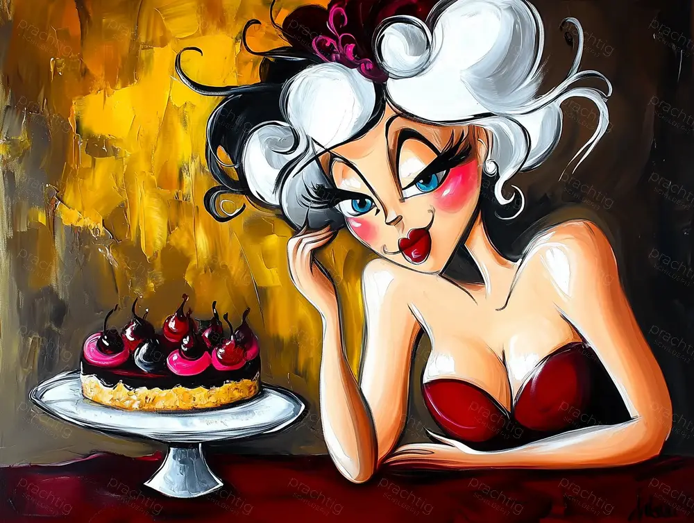 Een vrouw met een speelse uitstraling kijkt naar een taart, omgeven door warme tinten geel en rood. Haar expressieve ogen en uitnodigende glimlach trekken meteen de aandacht. De verf lijkt met energieke penseelstreken aangebracht, wat beweging en diepte geeft. Het contrast tussen het zwart-wit van haar haar en de levendige kleuren versterkt het speelse karakter van het schilderij. De taart op de voorgrond voegt een luchtig en uitnodigend element toe. Hang dit stuk in je eetkamer of keuken voor een vrolijke sfeer.