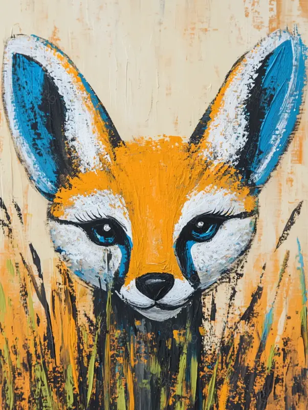 Een levendige vos staart je aan vanuit een kleurrijk veld. De felle oranje en blauwe tinten maken de vos direct opvallend tegen een lichte achtergrond. Dikke penseelstreken geven textuur en beweging, waardoor de vos bijna lijkt te leven. De speelse ogen en de gedetailleerde vacht trekken je aandacht en nodigen uit tot een langer verblijf in zijn wereld. Dit schilderij straalt energie en nieuwsgierigheid uit. Perfect voor een kinderkamer of woonkamer, waar het een frisse en speelse sfeer toevoegt.