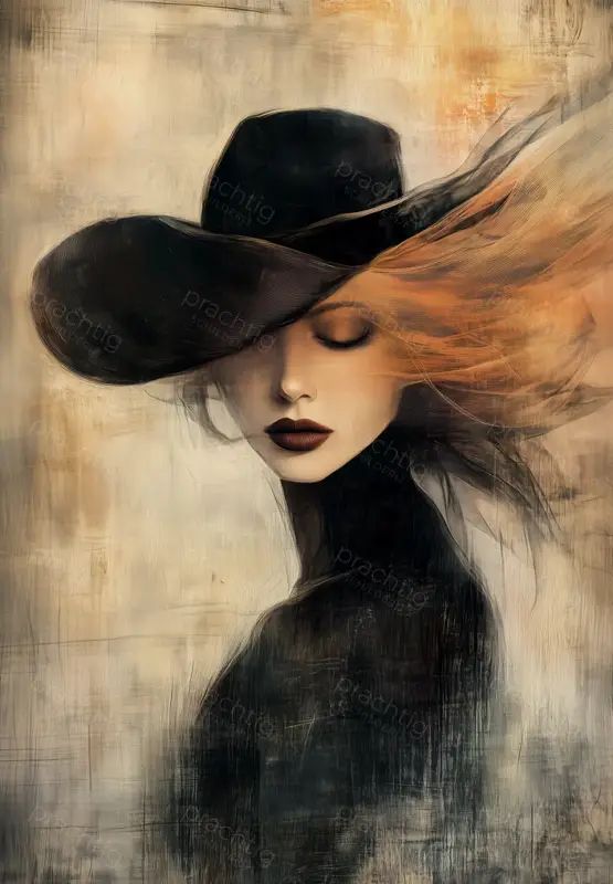 Ervaar de mysterieuze charme van een elegante vrouw met een grote zwarte hoed. Haar ogen gesloten, alsof ze in gedachten verzonken is. De zachte penseelstreken in aardetinten en de vloeiende lijnen van haar hoed en haar geven het werk een sfeervolle uitstraling. De combinatie van donkere en lichte tinten zorgt voor een intrigerend contrast. Deze afbeelding voegt een vleugje mystiek toe aan je interieur. Ideaal voor een stijlvolle leeshoek of slaapkamer.