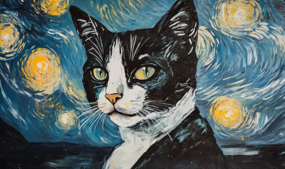 Dit unieke schilderij combineert de charme van een kat met de levendige draaiingen van een iconisch sterrennachtlandschap. De zwarte en witte kat straalt een serene rust uit, terwijl de felblauwe en gele achtergrond zorgt voor een dynamisch effect. De verfachtige textuur en de cirkelvormige patronen geven het werk een speelse en dromerige sfeer. Hang dit meesterwerk in jouw woonkamer, slaapkamer, of kantoor en breng een gevoel van nachtelijke magie binnen.