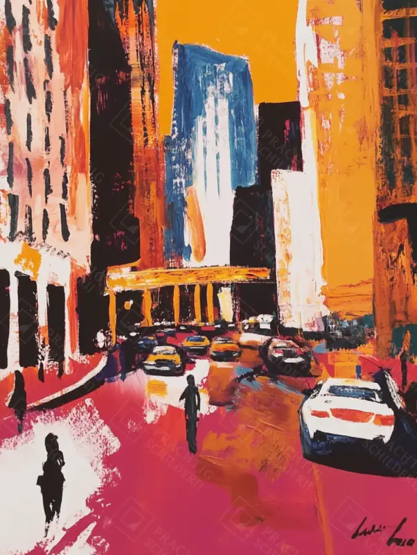 Zin in kleur met karakter? Dit schilderij vangt de energie van de stad in een explosie van tinten. Oranje en roze banen zich een weg door de drukte, terwijl blauw en wit voor contrast zorgen. De auto’s lijken haastig hun weg te vinden, alsof je midden in de stad staat.