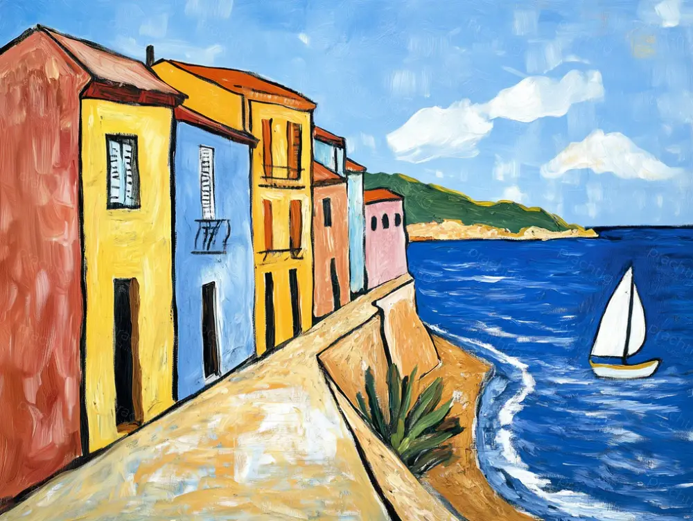 Een zonnig kustlandschap vol leven. Felle kleuren van huizen in geel, blauw en roze langs de promenade. De diepblauwe zee schittert in de zon. Een eenzame zeilboot vaart rustig over het water. De penseelstreken zijn speels en krachtig. Deze schilderstijl doet denken aan de werken van Vincent van Gogh. De levendige compositie brengt een warme en uitnodigende sfeer. Perfect voor een woonkamer of vakantiehuis.