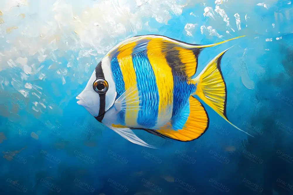 Een levendige tropische vis zwemt sierlijk door een blauwe oceaan. De opvallende strepen in geel, blauw en zwart maken de vis een echte blikvanger. Heldere penseelstreken brengen beweging en energie in het schilderij. De achtergrond vangt de speelse reflecties van zonlicht op het wateroppervlak. Dit werk brengt de schoonheid van de onderwaterwereld in jouw huis. Perfect voor een frisse toevoeging aan je interieur.
