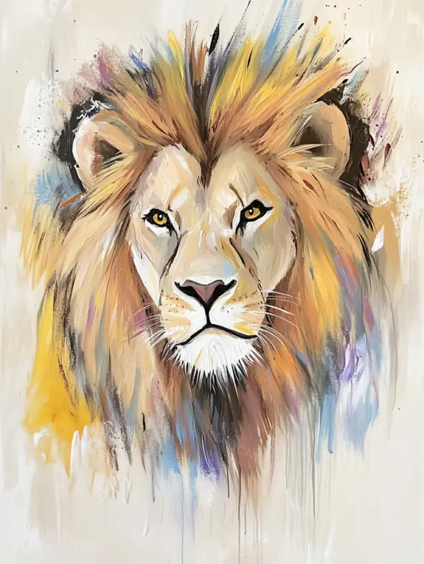 Een krachtige leeuw, recht in je ogen. Zijn manen exploderen in een kleurrijke wirwar van tinten. De levendige kleuren van geel, oranje en blauw brengen energie. De penseelstreken zijn verfijnd en dynamisch, waardoor de leeuw bijna tot leven komt. De achtergrond is zacht en neutraal, zodat de leeuw echt de show steelt. De expressieve stijl doet denken aan moderne kunst, met een speelse twist. Deze leeuw straalt moed en kracht uit. Hang het in de woonkamer of studeerkamer voor een sterke uitstraling.