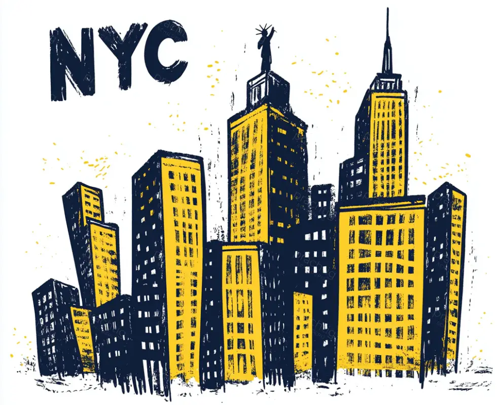 Ontdek de iconische skyline van New York. Deze compositie toont hoge wolkenkrabbers in levendig geel en diepblauw. Elk gebouw krijgt een unieke uitstraling door de contrasterende kleuren en grove penseelstreken. De Statue of Liberty siert de horizon en geeft het werk een herkenbaar element. Deze stedenafbeelding brengt energie en dynamiek in jouw ruimte. Perfect voor liefhebbers van de stadse sfeer.