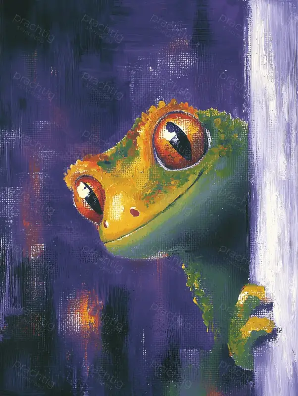 Een levendige gecko gluurt speels om een hoekje tegen een diepe paarse achtergrond. De heldere tinten groen en oranje van het dier contrasteren prachtig met de donkere omgeving, waardoor de gecko bijna tot leven komt. De dikke penseelstreken voegen textuur en diepte toe. Dit werk is perfect voor een speels thema en brengt kleur en energie in jouw ruimte.