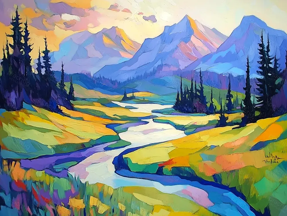 Ontdek een kleurrijk berglandschap waar glooiende heuvels en een slingerende rivier samenkomen. De lucht baadt in zachte pastelkleuren, terwijl de bergen op de achtergrond majestueus oprijzen. Donkere dennenbomen creëren een speels contrast met de levendige groene en gele velden. Deze compositie vangt de sfeer van een zomerse dag in de natuur. De penseelstreken zijn zichtbaar en geven het geheel een dynamische uitstraling. Hang dit werk in je woonkamer en breng de natuur naar binnen.