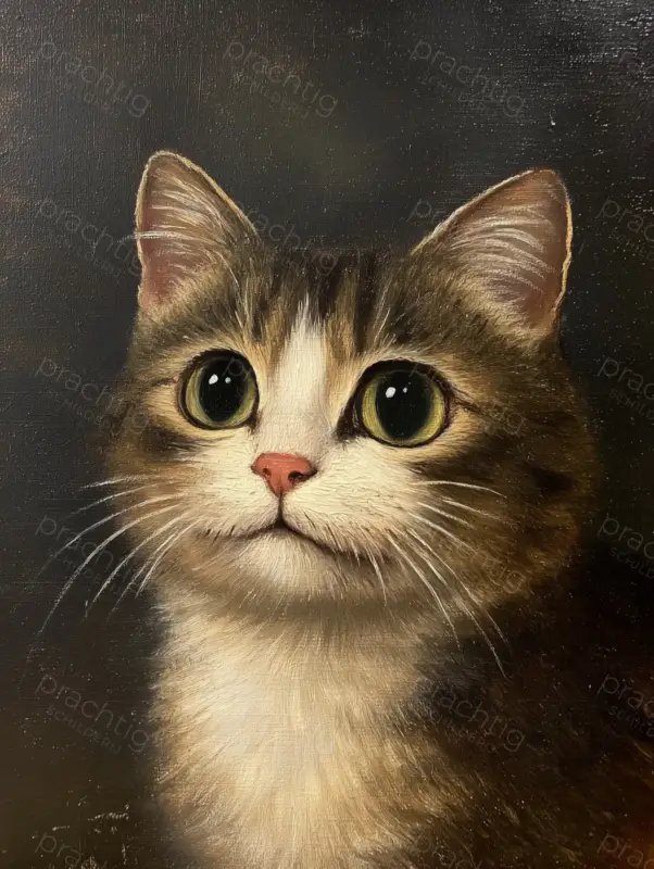 Dit schilderij toont een schattige kat met grote, indringende ogen. De kat kijkt nieuwsgierig en met een speelse blik naar de kijker. De achtergrond is donker, waardoor de warme tinten van de vacht en de heldere ogen nog meer opvallen. De kunstenaar heeft met verfijnde penseelstreken de textuur van de vacht en de glans in de ogen prachtig weergegeven. De rustgevende en tegelijkertijd boeiende uitstraling van de kat maakt dit kunstwerk ideaal voor in de woonkamer of studeerkamer. Het nodigt uit om langer naar te kijken en biedt een vleugje natuur en gezelligheid in je interieur.