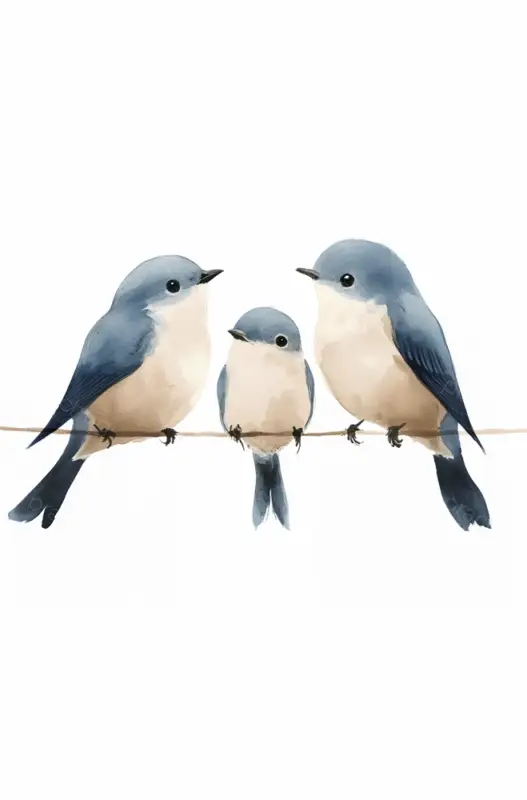 Drie schattige blauwe vogeltjes zitten op een dunne draad. Hun zachte blauwe en beige kleuren geven een rustige en vriendelijke uitstraling. De vogels lijken met elkaar te praten, wat een vrolijk tafereel creëert. De witte achtergrond zorgt ervoor dat de vogels extra opvallen. Dit schilderij brengt een speelse en luchtige sfeer in jouw huis. Perfect voor de woonkamer of kinderkamer.