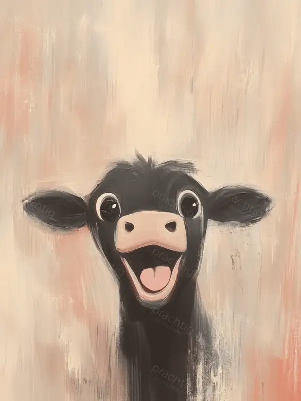 Een vrolijke koe kijkt je recht aan met grote, nieuwsgierige ogen. De achtergrond bestaat uit zachte, aardse tinten die de speelse uitdrukking van de koe versterken. Het contrast tussen de donkere vacht en de lichte achtergrond zorgt voor een levendige uitstraling. De losse penseelstreken geven het geheel een dynamische sfeer. Dit schilderij brengt een glimlach op je gezicht en past perfect in een kinderkamer of gezellige keuken.