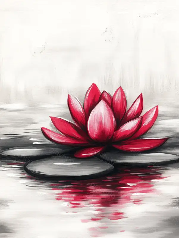 Een prachtige rode waterlelie drijft sierlijk op het water, omgeven door zachte grijstinten. De levendige rode bloembladeren trekken meteen de aandacht, een sterk contrast met de kalme, bijna etherische achtergrond. De subtiele reflectie in het water voegt een gevoel van beweging en diepte toe. Deze afbeelding straalt rust en sereniteit uit, perfect voor een ontspannen sfeer. Hang het in een slaapkamer of badkamer om een gevoel van vrede en schoonheid toe te voegen. De zachte penseelstreken en gedempte kleuren maken het tot een tijdloos stuk dat je ruimte opfleurt.