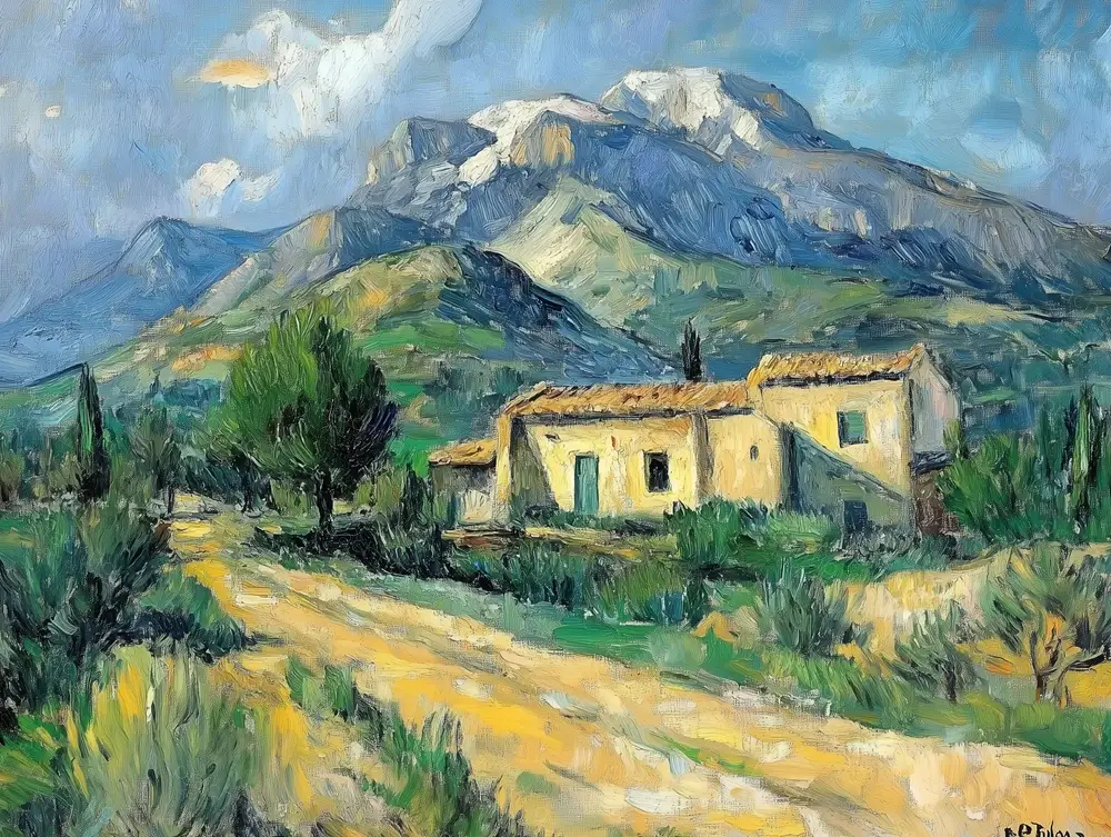 Geniet van een prachtig berglandschap met een schilderachtig huis in het midden. De levendige penseelstreken brengen de natuur tot leven. Heldere kleuren zoals groen en geel domineren. De bergen op de achtergrond geven een gevoel van diepte. Dit werk doet denken aan de stijl van beroemde Nederlandse schilders. Het schilderij straalt rust en warmte uit. Ideaal voor een woonkamer of studeerkamer.