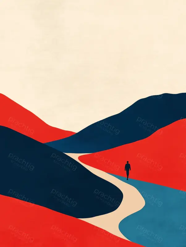 Ontdek een wereld van contrasten en eenvoud. Een eenzame wandelaar volgt een kronkelend pad. Rode en blauwe tinten domineren het landschap. Het werk roept een gevoel van avontuur en ontdekking op. De strakke lijnen en minimalistische vormen maken het schilderij sterk en krachtig. Een fijn voorbeeld van moderne kunst die de kijker uitnodigt tot dromen.