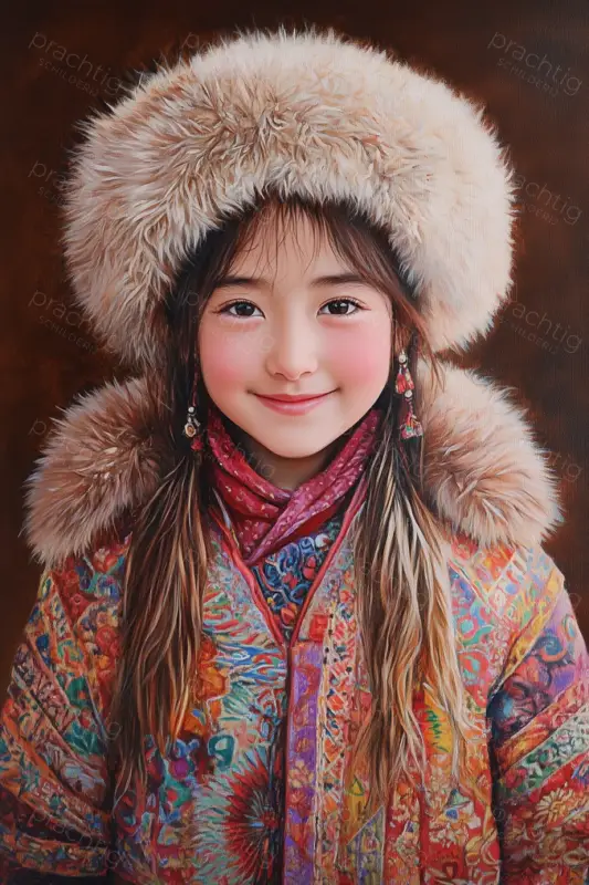 Er straalt een warme glimlach van het meisje met haar roze wangen. Ze draagt een bonten muts die haar gezicht omlijst en haar ogen laten je niet los. Haar jas is een explosie van kleuren en patronen. Het lijkt op een levendige lappendeken. De achtergrond is donker en laat haar stralen. De aandacht voor detail maakt het bijna tastbaar. Dit portret brengt vreugde en warmte, perfect voor een gezellige sfeer in huis.